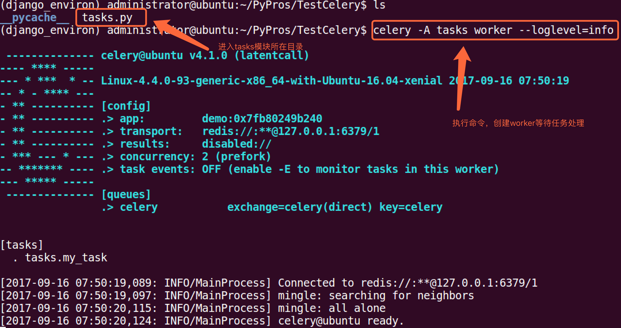 现在我们在创建一个worker, 等待处理队列中的任务.打开终端,cd到tasks.py同级目录中,执行命令: