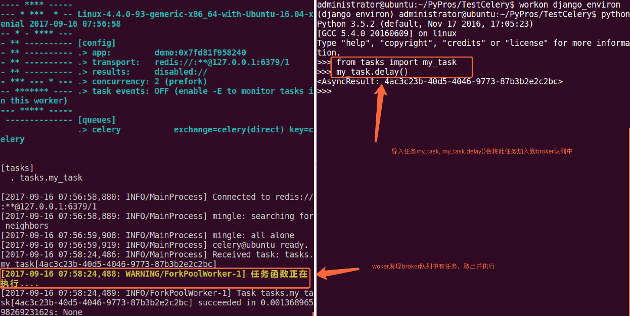 任务加入到broker队列中,以便刚才我们创建的celery workder服务器能够从队列中取出任务并执行。如何将任务函数加入到队列中,可使用delay()。