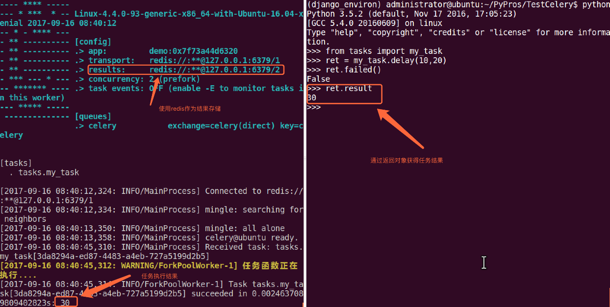 我们通过worker的控制台,可以看到我们的任务被worker处理。调用一个任务函数,将会返回一个AsyncResult对象,这个对象可以用来检查任务的状态或者获得任务的返回值。