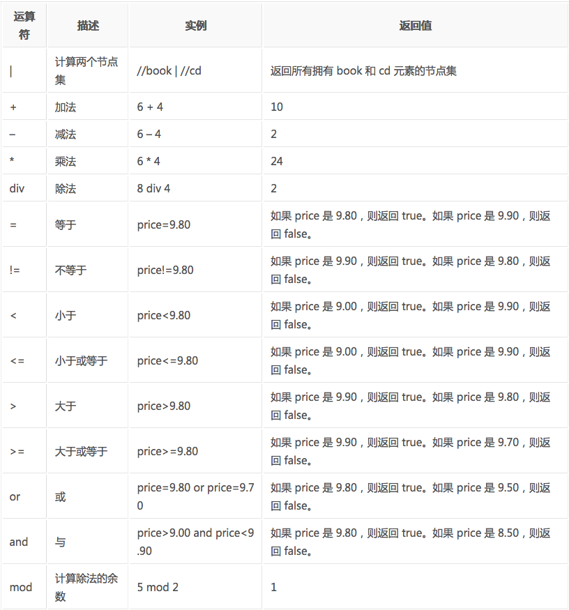 下面列出了可用在 XPath 表达式中的运算符: