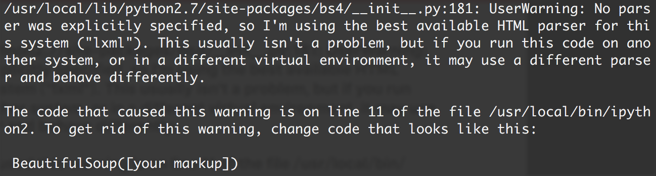 意思是,如果我们没有显式地指定解析器,所以默认使用这个系统的最佳可用HTML解析器(“lxml”)。如果你在另一个系统中运行这段代码,或者在不同的虚拟环境中,使用不同的解析器造成行为不同。